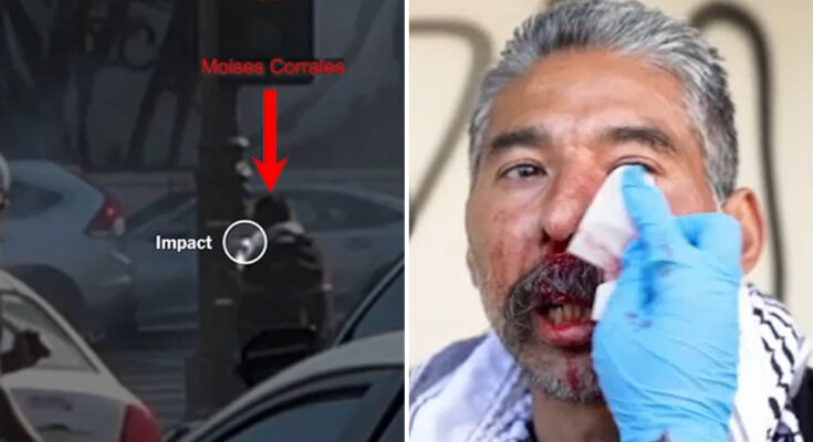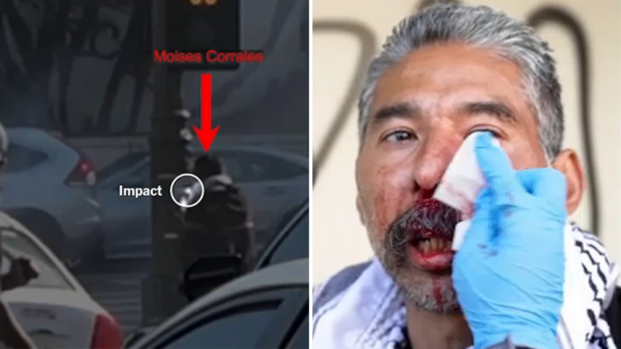 Bodycam video shows an officer firing the projectile at Corrales, who they say was among protesters who refused to disperse. Cellphone video from the crowd shows the moment Corrales was struck in the face. LAPD also released video that shows Corrales’ bloody face after he was hit.